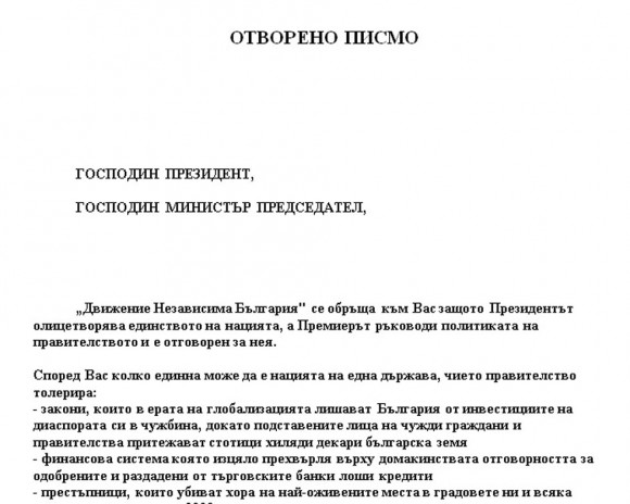 „Движение Независима България“ изпрати днес до българския президент Плевнелиев и до премиера Борисов Отворено писмо.