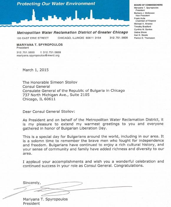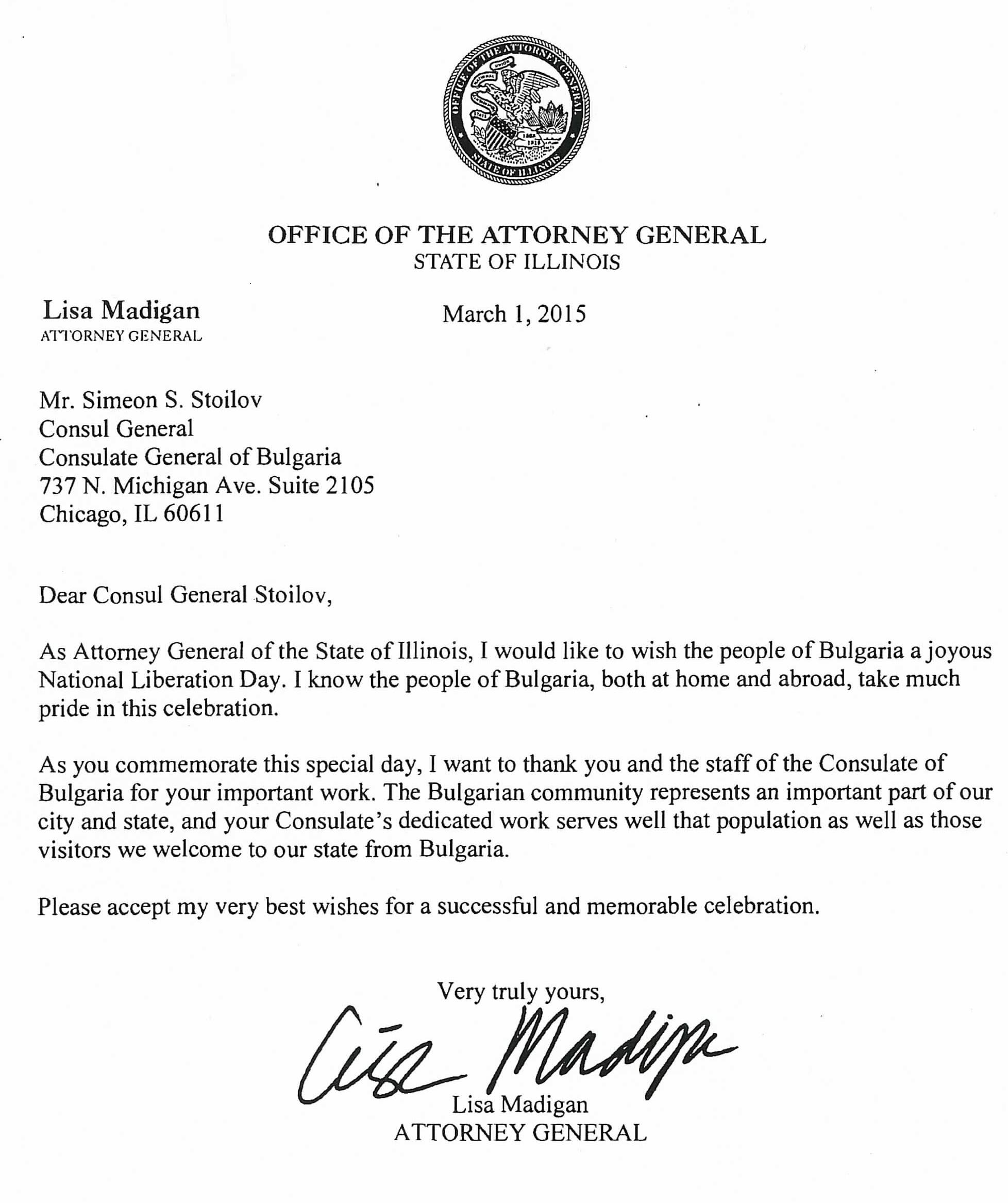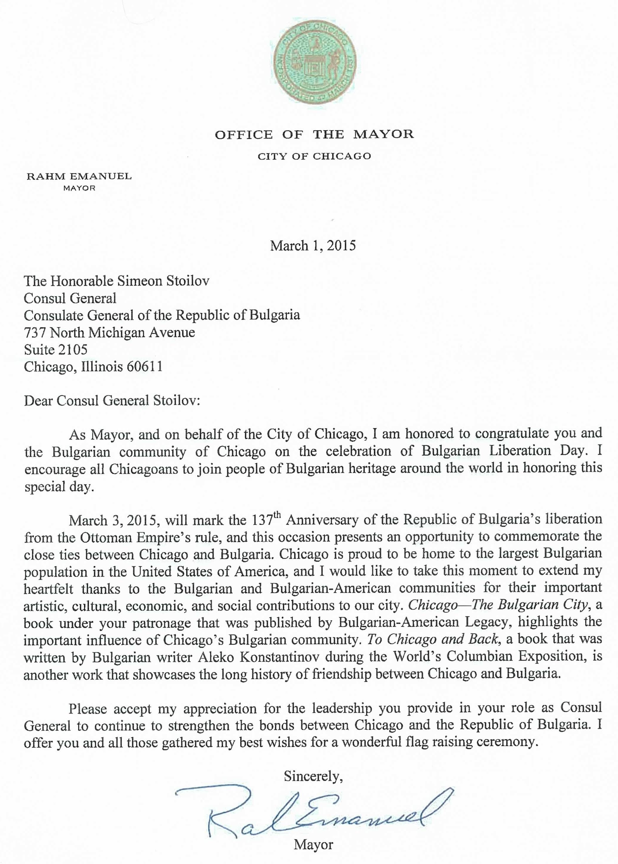 По случай Националния празник на България 3-ти март, българският генерален консул в Чикаго Симеон Стоилов е получил поздравителни писма от кмета на Чикаго Рам Емануел, от Лиса Мадиган, главен прокурор на щата Илинойс, и от Мариана Спиропулос, президент на компанията Metropolitan Water Reclamation District. Съдържанието на тези писма може да се види по-долу.