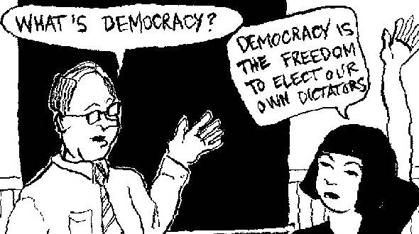 „Демокрацията се зароди от идеята, че всички, които са равни в един аспект, са равни абсолютно. Всички са еднакво свободни, следователно всички са абсолютно свободни… Следващата стъпка е, когато демократите, въз основа на твърдението, че всички са равни, настояват за равноправно участие във всичко.“