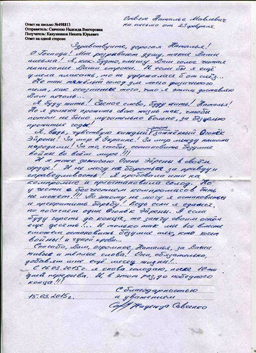 След като в продължение на 10 дни беше прекратила гладуването си, продължило почти 80 дни, пленената и държаната без съд и присъда в Москва украинка Надежда Савчено, отново обяви безсрочна гладна стачка. По-долу е съобщението от руските медии за това, както и някои лични писма на Надежда.