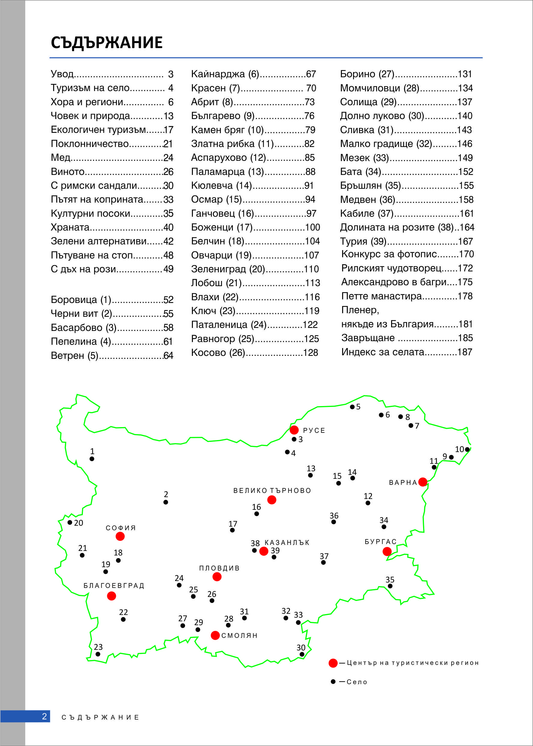 В специализираната част на книгата насочваме гостите към 39 конкретни села из цялата страна. Подбора сме направили на случаен принцип, но с цел да дадем представителна картина за селския туризъм в България. Всяка статия е символичен вход към конкретен туристически регион или съседни дестинации. Статиите изградихме с лично отношение и след целенасочени посещения на местата. В тях има много местни легенди, любопитни факти за фолклорните и кулинарните традиции, интересни сравнения между етнографските групи и различните социални модели на българското село през годините. В индекса на книгата са изброени 210 села от цялата страна.