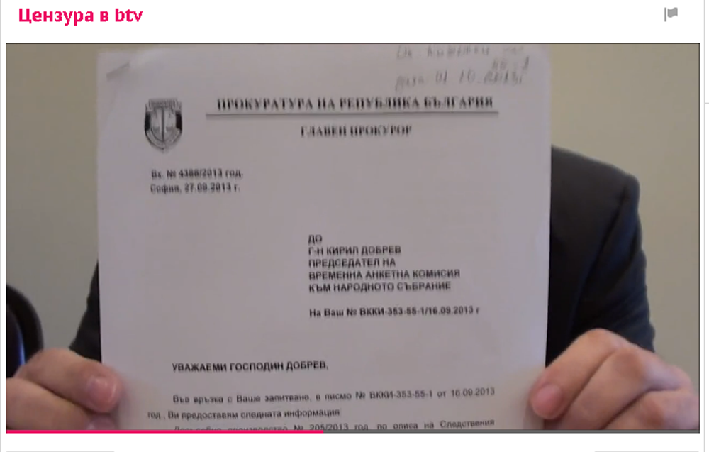 В случая става дума за показани през ноември м.г. по bTV слайдове на прословутото тефтерче на Златанов, които депутатът от БСП и председател на комисия в предишното НС Кирил Добрев предал на телевизията. Тогава Добрев каза, че ги е получил от Прокуратурата. Стефан Стойков цитира обаче и показва и писмо от главния прокурор до Кирил Добрев, от което става ясно, че Прокуратурата е отказала на Добрев да му предостави каквито и да било данни за тефтерчето на Златанов.