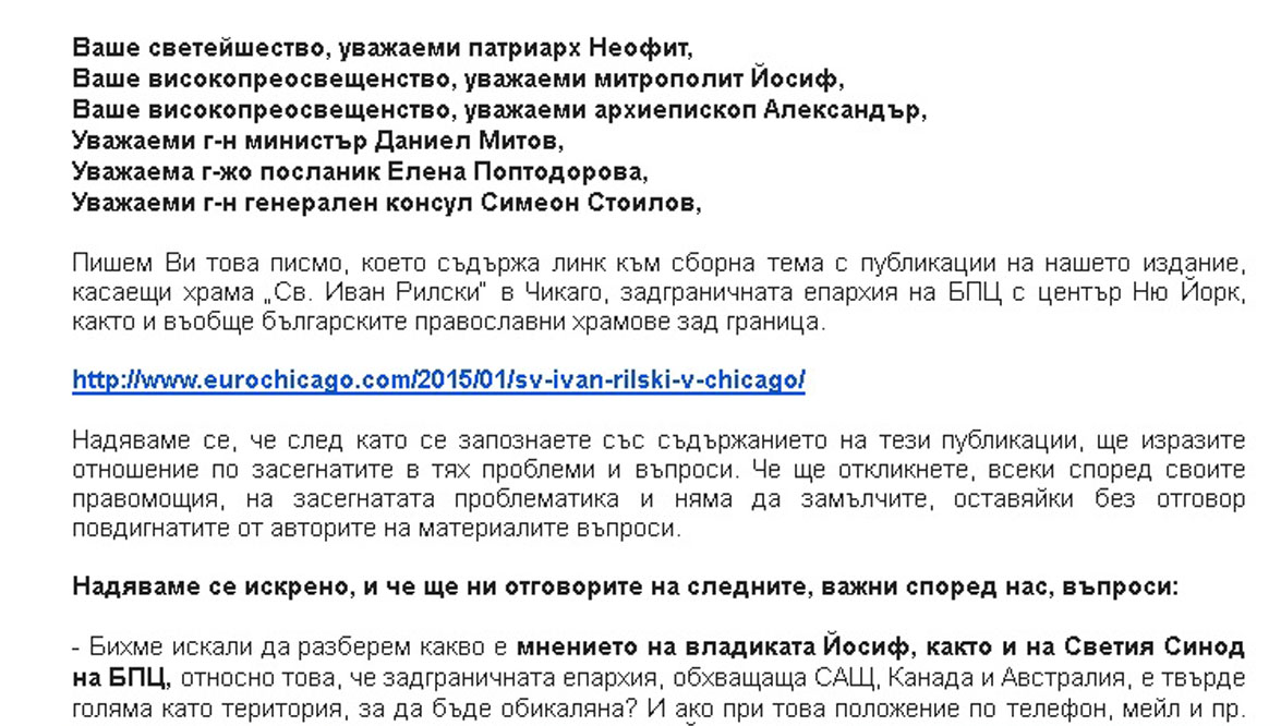В писмото става дума за храма „Св. Иван Рилски“ в Чикаго, задграничната епархия на БПЦ, обхващаща САЩ, Канада и Австралия, както и въобще за българските православни храмове зад граница. В него се апелира към съответните висши църковни клирици и към представителите на българската държава да се запознаят със публикувани в нашето издание поредица от материали по тази тематика. И се отправят конкретни въпроси към патриарх Неофит, митрополит Йосиф, Св. Синод на БПЦ, архиепископ Александър от OCA, българското Външно министерство.