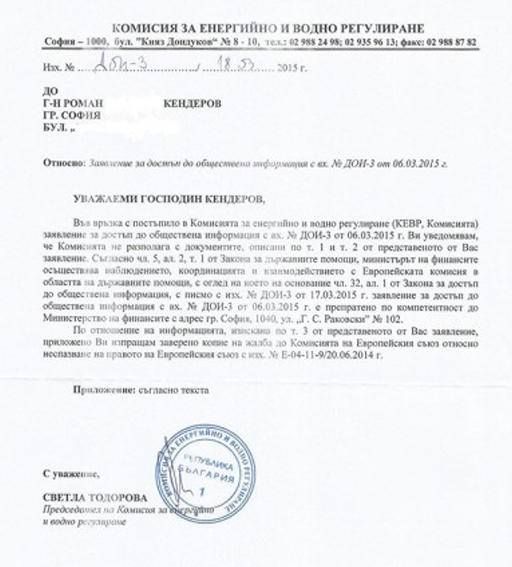 ДКЕВР му предоставя на 18 март т.г. само един от исканите от него документи, който е копие от жалба на председателя на ДКЕВР Боян Боев до Европейската комисия, относно неспазването правото на Европейския съюз, изпратена на 20.06.2014 г.