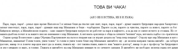 „Пари, пари, пари! – рекъл едно време Наполеон I и зяпнал беше да глътне цял свят; пари, пари, пари! – думат нашите букурещки народни базиргени и слухтят де кой ще да умре, за да му лапнат имотецът; пари, пари, пари! – думаше наш кир Михалаки и беше – чорбаджия. Парите са ум, парите са чувства, парите са живот, парите са бог. За пари Генович е станал шпионин, Найденов мекере, а Михайловски подлец – само нашите букурещки патриоти не работят за пари в кафенето, а за да им се смеле ястието в стомаха.“ (Петко Симеонов цитира част от безсмъртния текст на Ботев „Това ви чака!“, публикуван за първи път през 1873 г. – б.р.)