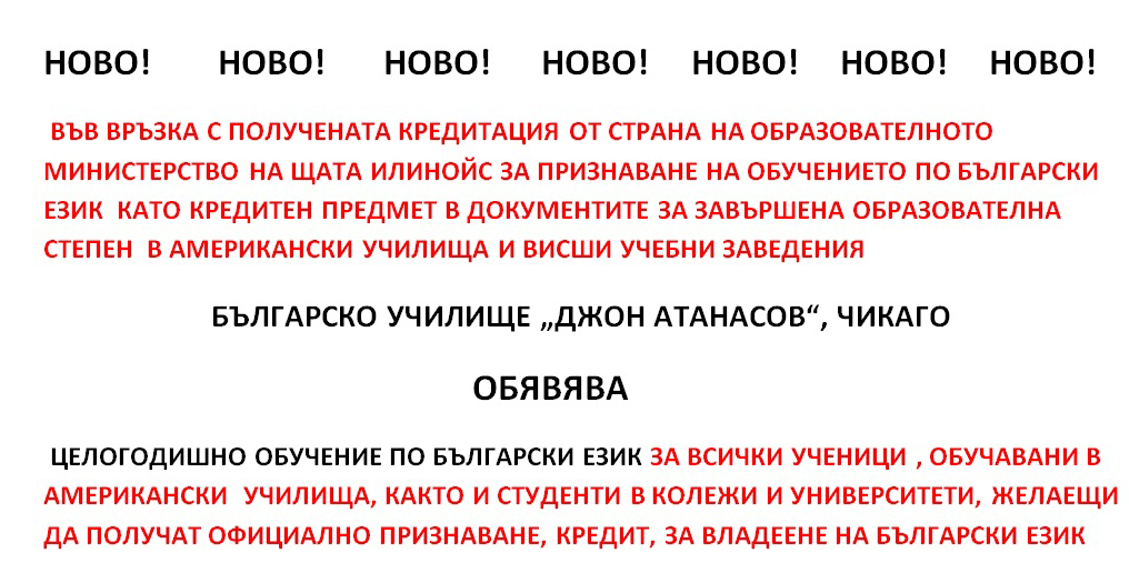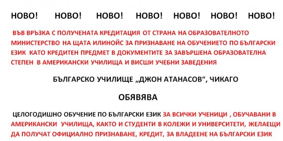 ВЪВ ВРЪЗКА С ПОЛУЧЕНАТА АКРЕДИТАЦИЯ ОТ СТРАНА НА ОБРАЗОВАТЕЛНОТО МИНИСТЕРСТВО НА ЩАТА ИЛИНОЙС ЗА ПРИЗНАВАНЕ НА ОБУЧЕНИЕТО ПО БЪЛГАРСКИ ЕЗИК КАТО КРЕДИТЕН ПРЕДМЕТ В ДОКУМЕНТИТЕ ЗА ЗАВЪРШЕНА ОБРАЗОВАТЕЛНА СТЕПЕН В АМЕРИКАНСКИ УЧИЛИЩА И ВИСШИ УЧЕБНИ ЗАВЕДЕНИЯ