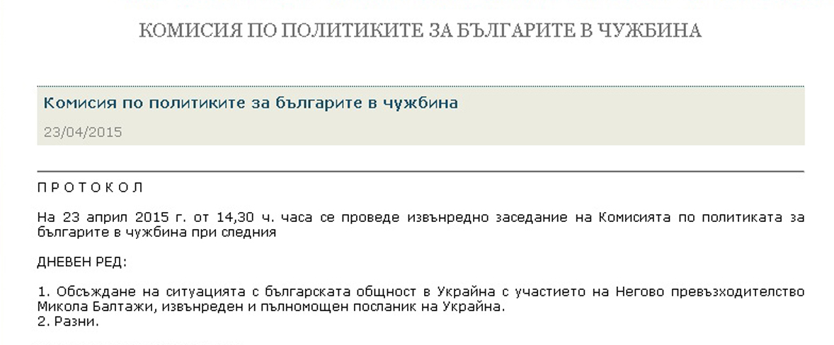На 23 април 2015 г. от 14,30 ч. часа се проведе извънредно заседание на Комисията по политиката за българите в чужбина при следния