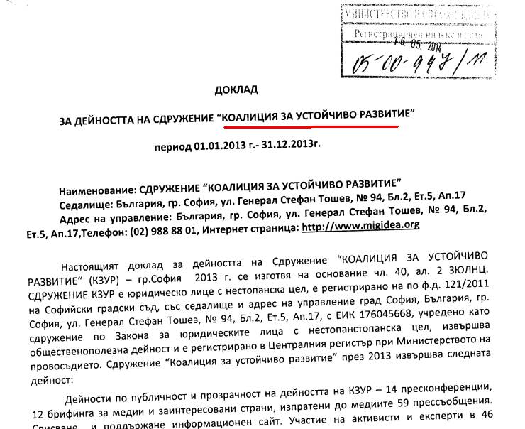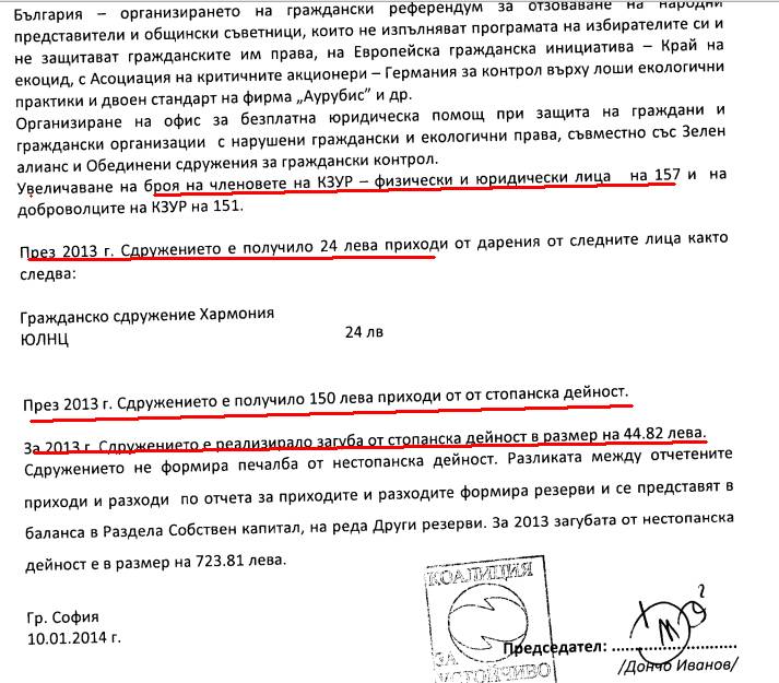 Как псевдоеколози изнудват фирми за стотици хиляди левове? След като в Новините на Нова телевизия излъчиха откъс от разследването на Марин Николов, в което псевдоеколозите изнудват за 200,000.00 евра се оказа, че дори и държавата е била жертва на подобен зелен рекет. По-долу вижте факсимиле от годишните отчети за дейността на КОАЛИЦИЯ ЗА УСТОЙЧИВО РАЗВИТИЕ с код по БУЛСТАТ – 176045668 – там парите от рекета не се описват.