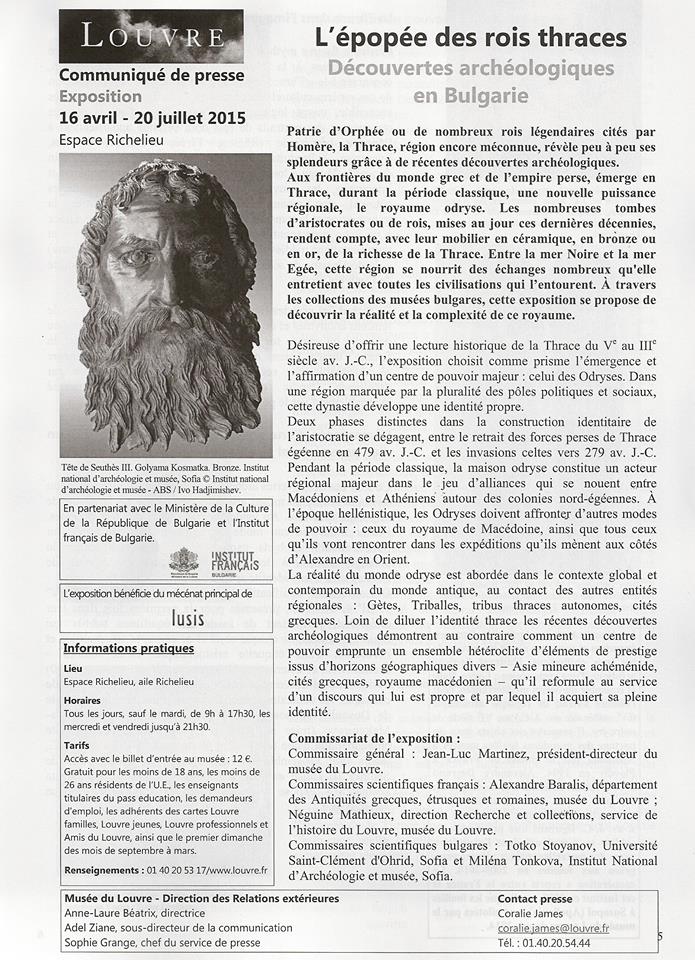 Бях на пресконференцията в Лувъра. Не знам какво ще публикуват колегите от София. Аз споделям във Фейсбук първата страница на досието, предназначено за пресата. В него има думи като Тракия, Атина, Александър Велики, Македония. Заглавието е: „Епопеята на тракийските крале“. От цялата страница, България я има само като подзаглавие, с по-бледи букви: „Археологически открития в България“.