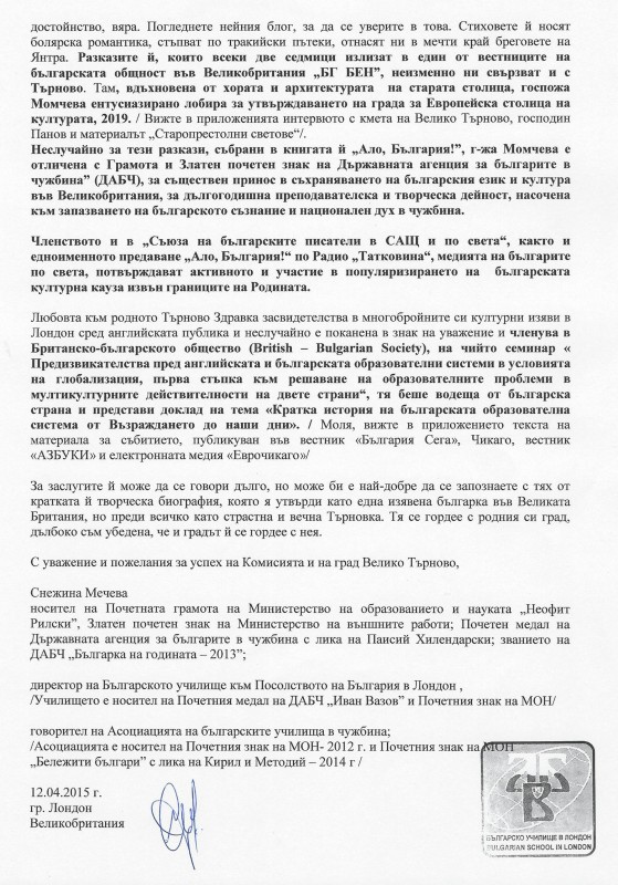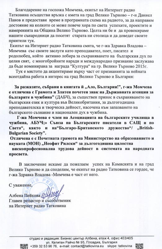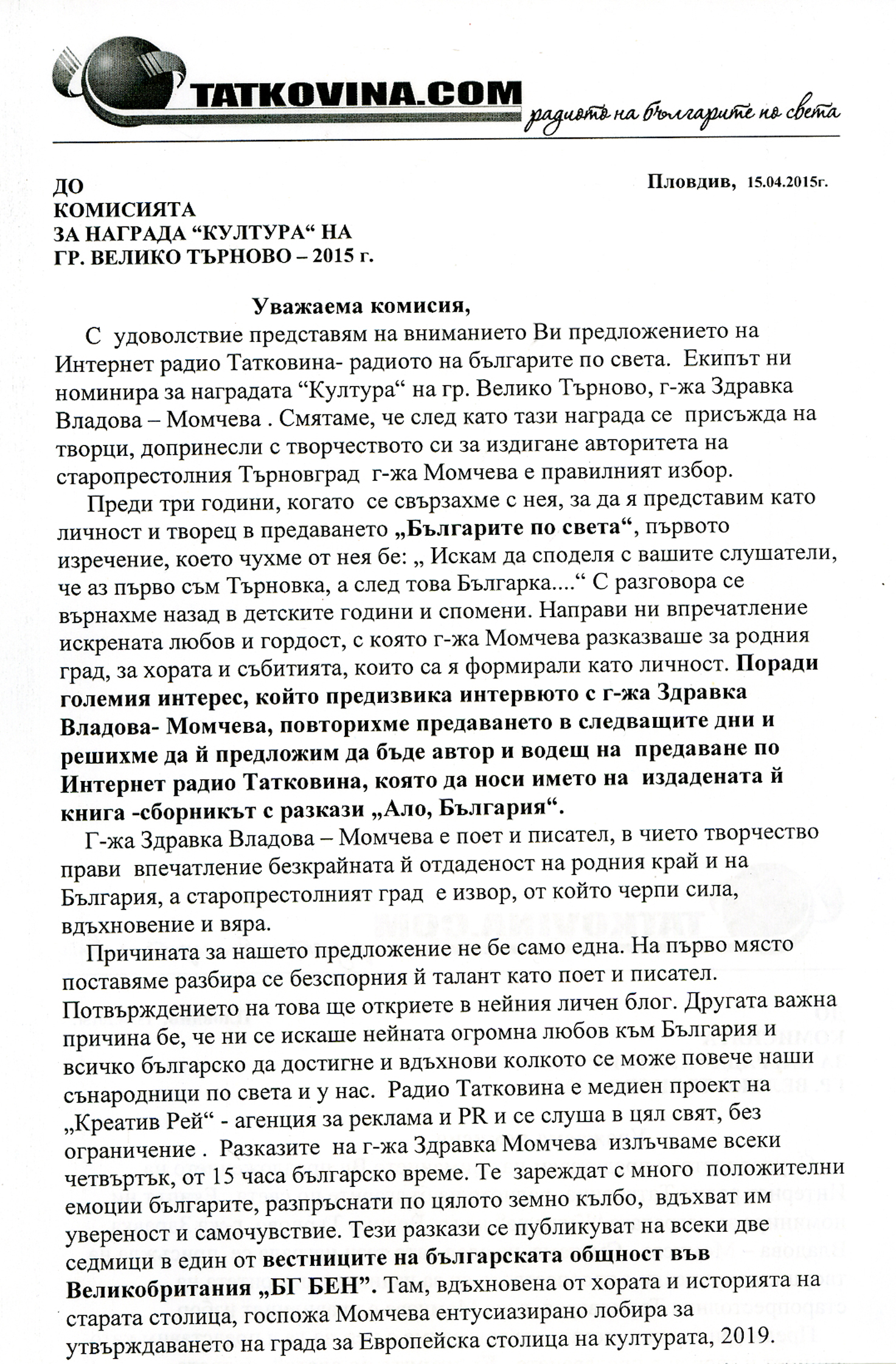 Във връзка с номинациите на ежегодната награда „Култура“ за град Велико Търново, имам удоволствието да се обърна към Вас с предложение в тях да бъде включена и госпожа Здравка Владова-Момчева, дългогодишен постоянен сътрудник на вестник „БГ БЕН“, Великобритания , писател, поет и автор на рубриката „Очи в очи“, която излиза във всеки брой на тази медия.