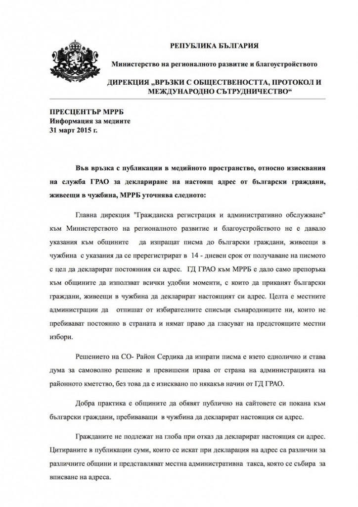 След публикацията от пресцентъра на МРРБ се получи следното съобщение, в което се твърди, че Общината е проявила творчески подход в интерпретацията на писмо на ГРАО. ГД ГРАО към МРРБ е дало само препоръка на общините да използват подходящ момент и да приканят българите в чужбина, да декларират настоящия си адрес, за да бъдат отписани от избирателните списъци, ако пребивават в чужбина. МРРБ потвърждава, че не са предвидени санкции. „Решението на СО – Район Сердика да изпрати писма е взето еднолично и става дума за самоволно решение и превишени права от страна на администрацията на районното кметство, без това да е изисквано по някакъв начин от ГД ГРАО“ – уточняват от министерството. Не става обаче ясно защо ГРАО е впрегнало общините да издирват адресите на българите в чужбина, след като те веднъж са декларирали държавата, в която живеят и ГРАО има достъп служебно до тези данни. Следва пълния текст на съобщението.
