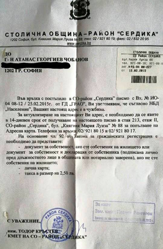 Ако живеете в чужбина и получите стряскащо писмо, че трябва в 14 дневен срок да се явите в общината, да се пререгистрирате и да платите 2.50, изхвърлете го в кофата.