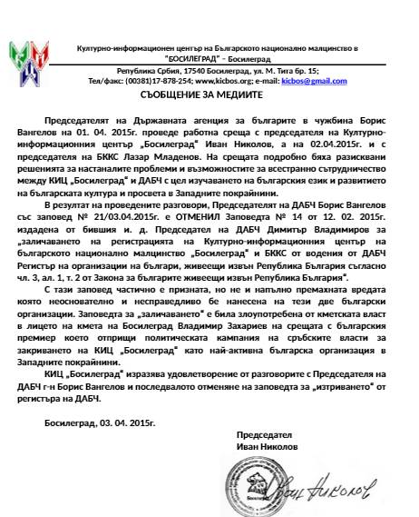 След проведена работна среща с новия председател на ДАБЧ Борис Вангелов, Културно-информационният център на българите в Босилеград изпрати до медиите съобщение. В него се казва, че на срещата са били разисквани решения за настъпилите проблеми и възможностите за всестранно сътрудничество между КИЦ „Босилеград“ и ДАБЧ. Както и, че в резултат на проведените разговори, председателят на ДАБЧ Борис Вангелов е издал заповед, с която е отменил заповедта за заличаването на регистрацията на Културно-информационния център на българското национално малцинство „Босилеград“ и БККС от водения от ДАБЧ Регистър на организации на българи, живеещи извън Република България съгласно чл. 3, ал. 1, т. 2 от Закона за българите живеещи извън Република България.