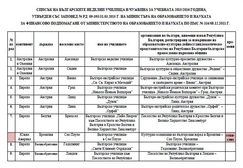 Министерството на образованието и науката публикува на сайта си списък на българските неделни училища в чужбина за учебната 2015/2016 г., утвърден със Заповед № РД 09-393/31.03.2015 г. на министъра на образованието и науката. Списъкът е за финансово подпомаганите от МОН училища зад граница, по ПМС № 334/8.12.2011 г.