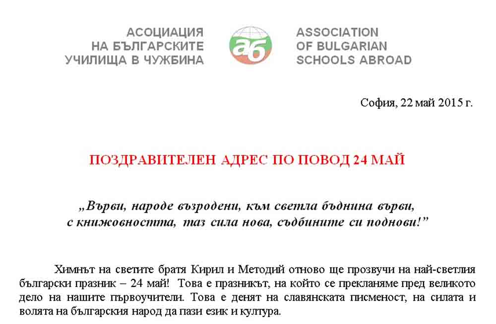 ПОЗДРАВИТЕЛЕН АДРЕС ПО ПОВОД 24 МАЙ