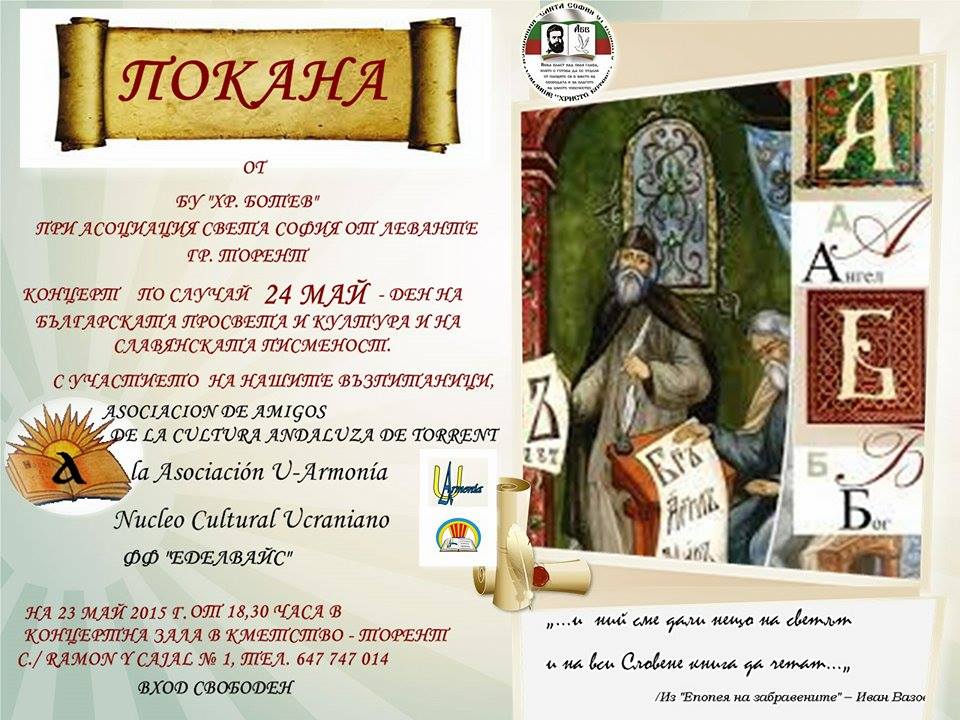 В във връзка с Деня на българската просвета и култура и на славянската писменост, Българско училище „Христо Ботев“ в гр. Торент, Испания, организира концерт. Събитието ще се състои на 23 май от 18.30 ч. местно време в концертната зала на кметството на гр. Торент.