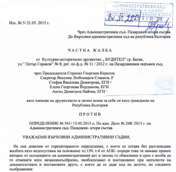 КИД „Будител“ обжалва определението на Административния съд – Пазарджик пред Върховния административен съд (вж. тук – жалба на КИД Будител). Смятаме определението на АС – Пазарджик за необосновано, че прехвърлянето на имота не накърнявало нашите права и свободи, и достъпа до него?! А съставянето на документи с невярно съдържание от община Батак не се коментират?! Такъв е акт №110/2000 г. на Община Батак, с който е присвоен имот Историческа църква, без това да е предхождано от акт на Министерски съвет за раздържавяване на имота и понижаване на неговия статут.