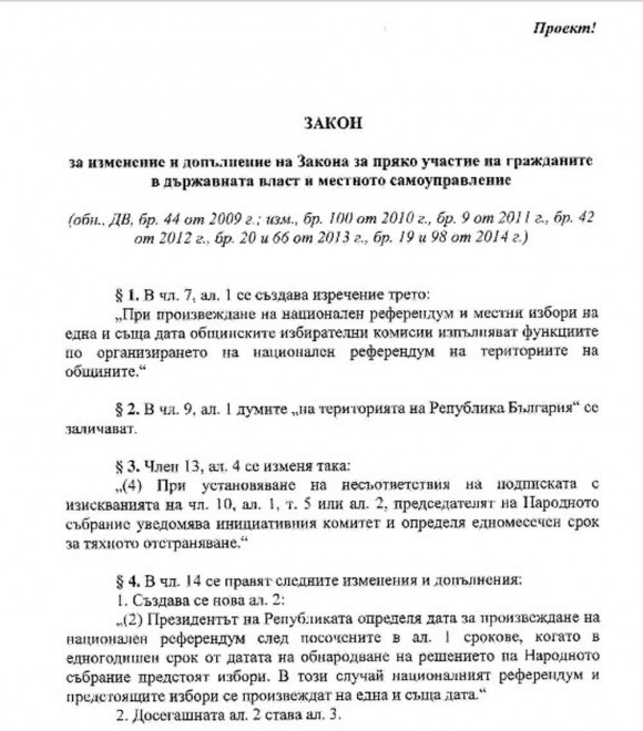 На 22 май т.г. в българското Народно събрание е внесен Законопроект за изменение и допълнение на Закона за пряко участие на гражданите в държавната власт и местното самоуправление. Законопроектът е бил внесен в Комисията по правните въпроси и в Комисията по взаимодействието с неправителствените организации и жалбите на гражданите.