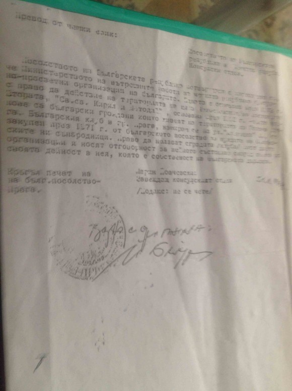 Как да си обясним, имайки предвид този документ, подписан от завеждащия консулския отдел на Посолството през 1994 г., сегашното становище на Министерството на външните работи на Р. България, че Българската културно-просветна организация в Чехия се е самонастанила в сградата на Българския клуб на ул. „Америцка“ в Прага?
