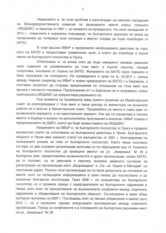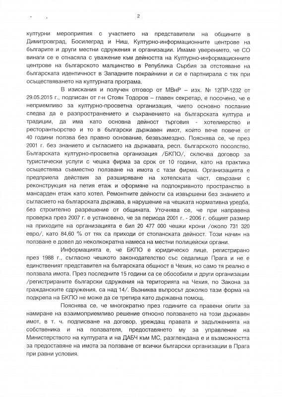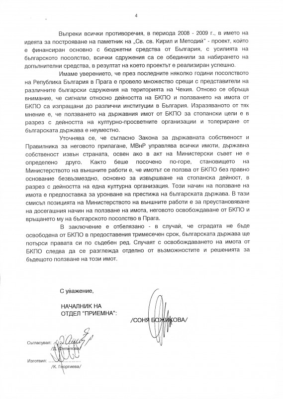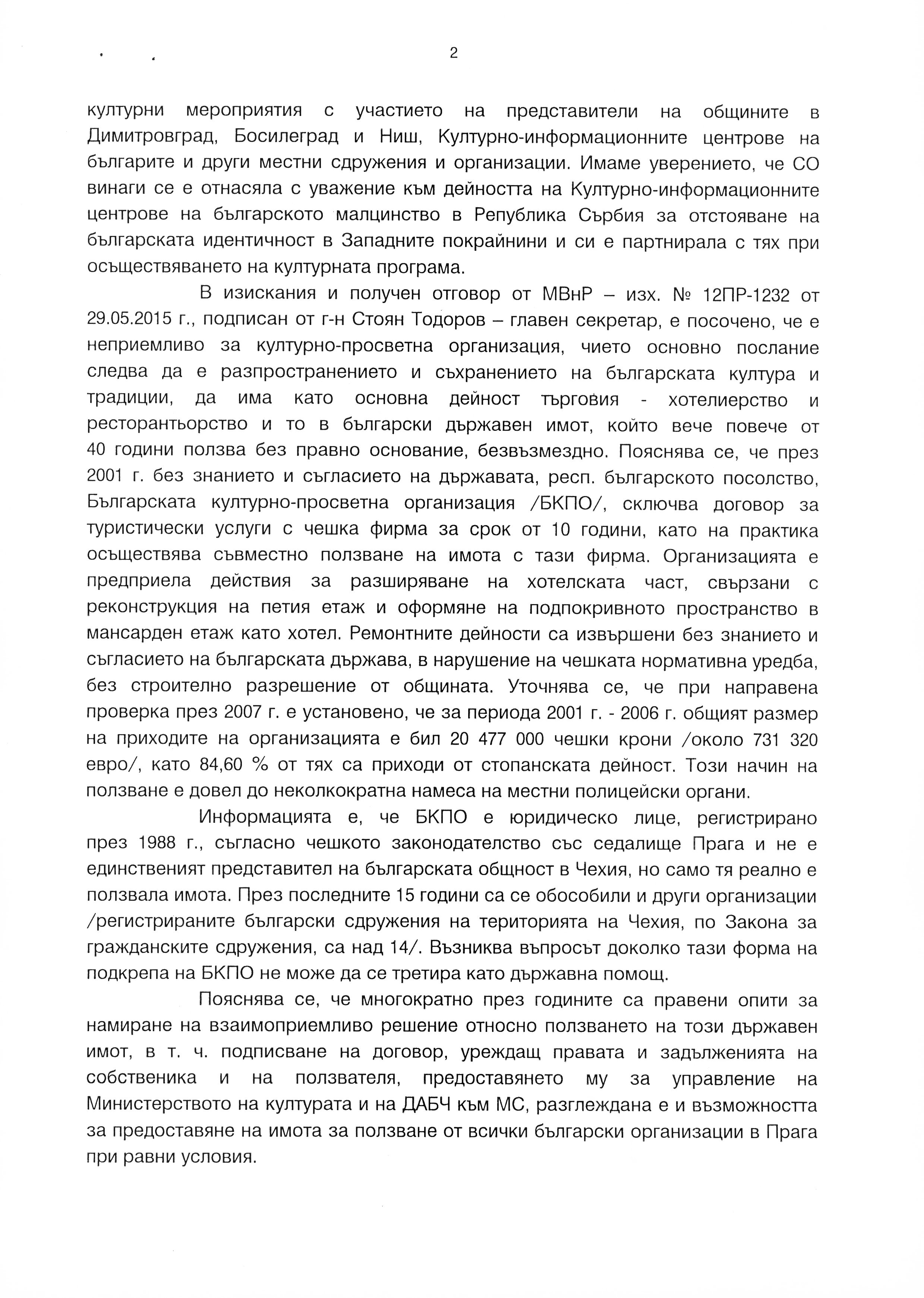 На 4 юни от Администрацията на Министерски съвет на Р. България получихме писмо, свързано с наши сигнали до институциите, касаещи Културно-информационния център на българите в Босилеград, Р. Сърбия, и сградата на ул. „Америцка“ 28 в Прага, т.е. Българския клуб в чешката столица. Отговорът е подписан от началника на отдел „Приемна“ в МС г-жа Соня Божикова, на която благодарим за това, че тя винаги съвестно е завеждала нашите сигнали по различни поводи, и че това е довеждало до отговори от ресорни институции.