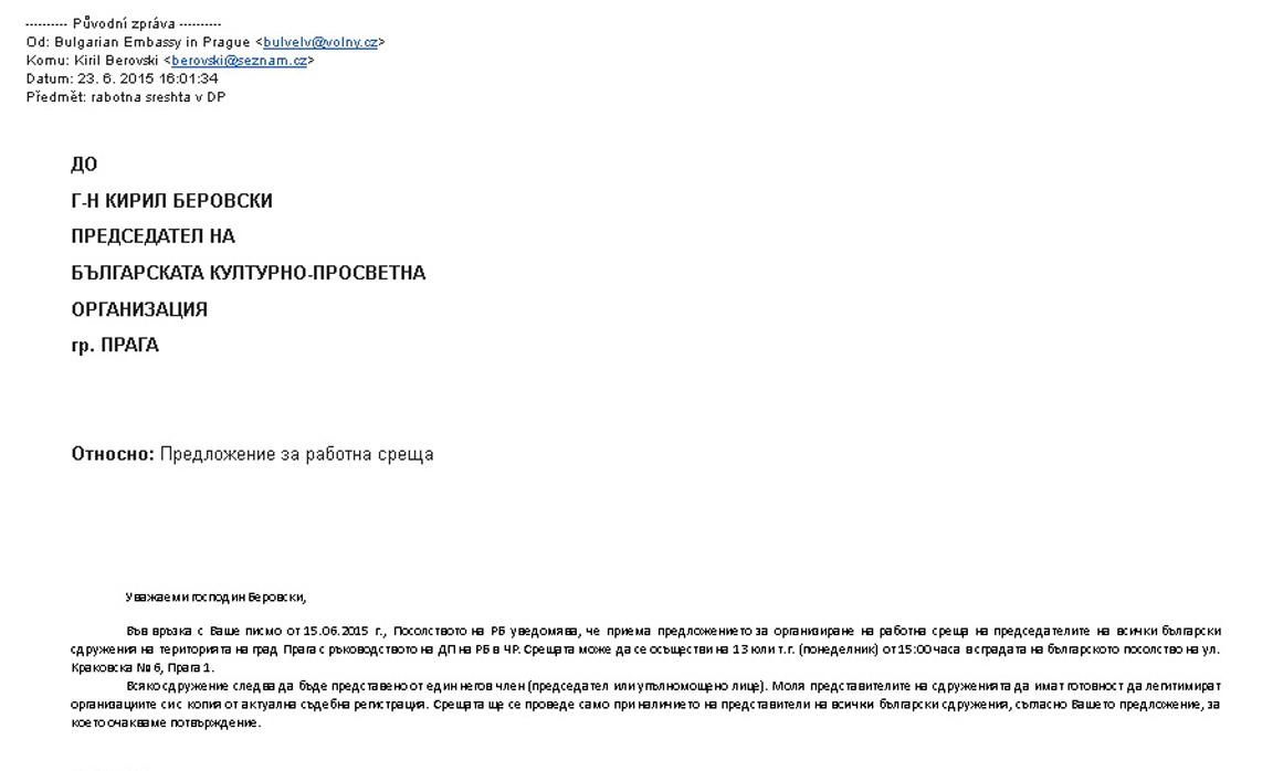 Във връзка с Ваше писмо от 15.06.2015 г., Посолството на РБ уведомява, че приема предложението за организиране на работна среща на председателите на всички български сдружения на територията на град Прага с ръководството на ДП на РБ в ЧР. Срещата може да се осъществи на 13 юли т.г. (понеделник) от 15:00 часа в сградата на българското посолство на ул. Краковска № 6, Прага 1.