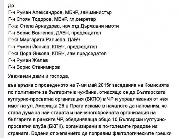 Публикацията съдържа отговор, изпратен от Управителния съвет на БКПК в Прага, във връзка с проведеното на 7-ми май 2015 г. заседание на Комисията по политиките за българите в чужбина, отнасящо се до Българската културно-просветна организация (БКПО) в Чехия и управлявания от нея имот на ул. „Америцка“ 28 в Прага. Този отговор е бил изпратен до зам. външния министър Румен Александров, до главния секретар на МВнР Стоян Тодоров, до началничката на отдел „Държавни“ имоти в МВнР Стела Арнаудова, до председателя на ДАБЧ Борис Вангелов, до експертката от ДАБЧ Маргарита Ралчева, до председателя на Комисията по политиките за българите в чужбина Румен Йончев и до членовете на тази комисия Дора Янкова, Румен Желев и Борис Станимиров още на 19 май т.г.