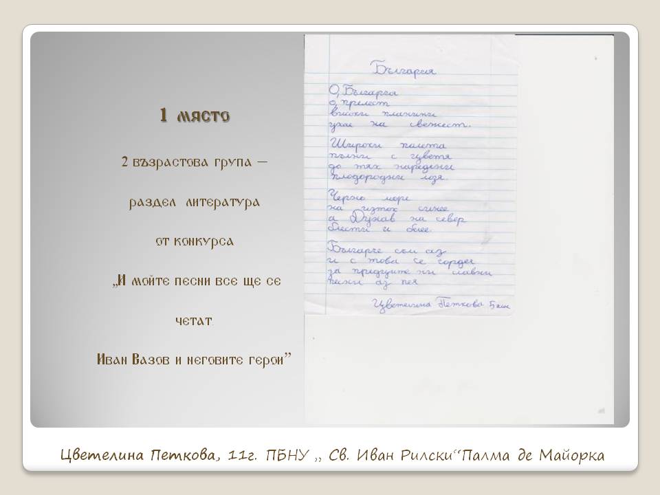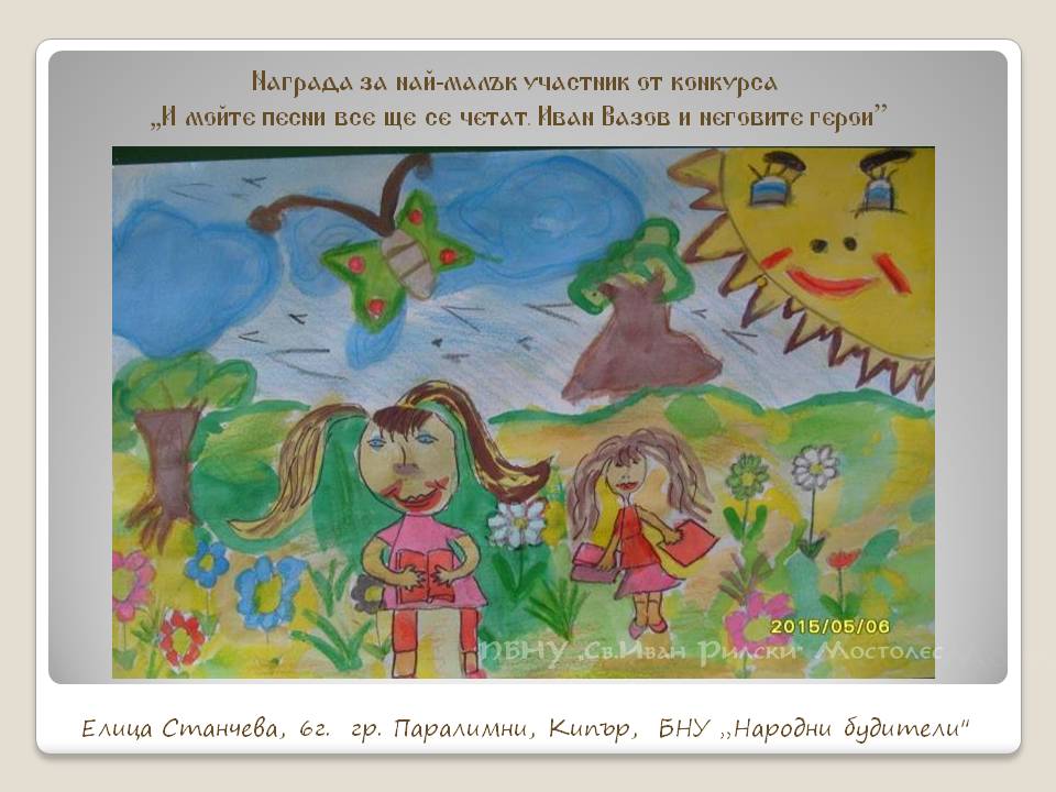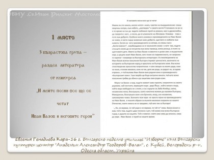 Имали ли сте някога, когато четете книга, чувство на въодушевление: сякаш хвърчиш нагоре, към небето, „разтворен“ в своите мечти? Случвало ли ви се е по време на сън да видите любимия герой на романа, мил и дружелюбен, да говорите с него, а после да се усмихнете на сбогуване. Усмивка – това е пътят към доброто. Особено много усмивка в произведенията на Иван Вазов – на човек, в чието сърце живееше само доброто, щастието и любовта към живота. Когато аз чета произведенията на автора, аз сякаш съм в „безтегловност“, освобождавам се от железните окови и летя там, където слънцето може да се почувства във всяка тревица, всяка росица, в очите на щастливото дете. Името на Иван Вазов е известно в целия свят; и възрастните хора, и децата знаят Иван Вазов, като гения на съвременността, не напразно го наричат «патриарх на българската литература». В стихотворенията на Иван Вазов всички поколения българи откриват ценностите, величието на историята на българския народ и красотата на българската земя. Във всяко стихотворение присъства патриотизъм: «език свещен на моите деди, език на мъки, стонове вековни, език на тая, дето ме роди, за радост не, за ядове отровни…» – тъй възпява Иван Вазов своя родния език в произведението «Българският език». Тази творба ще бъде актуална винаги, тъй като всяко поколение трябва да обича и да защитава своя роден език.