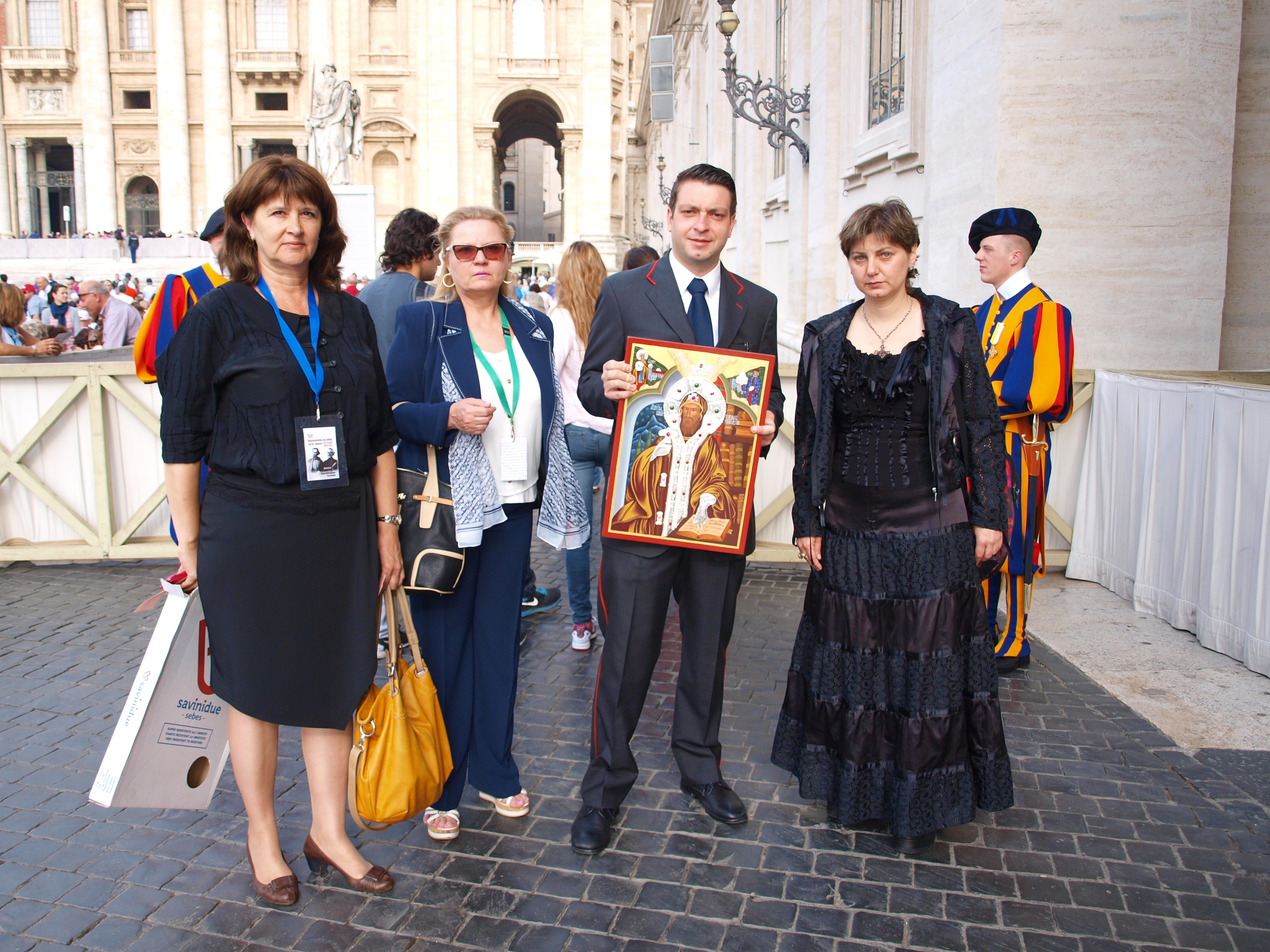 Отдясно наляво: д-р Адриана Любенова, автор на иконата; представителят на Ватикана; Петя Цанева, президент на асоциация „Балкан” в Мадрид и главен координатор на организираното поклонение на представители на 17 български училища зад граница на гроба на св. Кирил в Рим; Надя Кантарева-Барух, главен редактор на издателство „Аз Буки“.