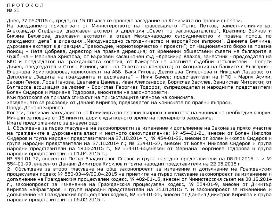 На заседанието присъстват: от Министерството на правосъдието – Петко Петков, заместник-министър, Александър Стефанов, държавен експерт в дирекция „Съвет по законодателство”, Красимир Войнов и Биляна Белякова, държавни експерти в отдел Международно сътрудничество и правна помощ по граждански дела” в дирекция „Международно сътрудничество и европейски въпроси”, Даниела Белчина, държавен експерт в дирекция „Правосъдие, нормотворчество и проекти”; от Националното бюро за правна помощ – Петя Добрева, директор на правна дирекция; от Временни обществени съвети на българите в чужбина – Мариана Христова; от Върховен касационен съд – Красимир Влахов, заместник – председател на ВКС и председател на Гражданската колегия; от Камарата на частните съдебни изпълнители – Георги Дичев, председател и Стоян Якимов, член на Съвета на камарата; от Асоциация на банките в България – Елеонора Христофорова, юрисконсулт на АББ, Валя Гигова, Десислава Симеонова и Николай Лазаров; от Движение „Защита на гражданите и държавата” – Илия Бачев; представители на НПО – Мария Асими, Захари Генов, Лора Ненова, Цветанка Цанева, Иван Александров, Борислав Василев, Венцислав Митовски; от Българска асоциация за лизинг – Борислав Георгиев Тодоров, съпредседател и народните представители Волен Сидеров и Мариана Тодорова, вносители на законопроекти. Към протокола се прилага списъкът на присъстващите членове на комисията. Заседанието се ръководи от Данаил Кирилов, председател на Комисията по правни въпроси.