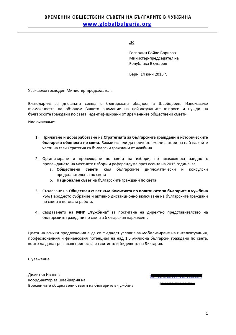 Както вече информирахме нашите читатели (вж. тук), на 14 юни т.г. в Берн се състоя среща на българския премиер Борисов с българи от Швейцария. На тази среща Димитър Иванов, представител на Временните обществени съвети на българите в чужбина, връчи на премиера Борисов писмо от името на ВОС, което съдържа четири предложения. Те са свързани с Националната стратегия за българските граждани и историческите български общности по света, институционалното представителство на българите зад граница и създаването на Обществени съвети към ДКП, създаването на Обществен съвет към Комисията по политиките за българите в чужбина при НС и създаването на МИР „Чужбина“.