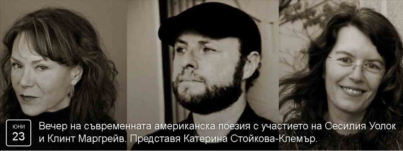 „Талантливите и изявени американски поети Сесилия Уолок и Клинт Маргрейв посещават България за първи път и за първи път се срещат с българската публика. Ще четем стихове на два езика, ще разговаряме за американската поезия, ще отговаряме на въпроси. Заповядайте!