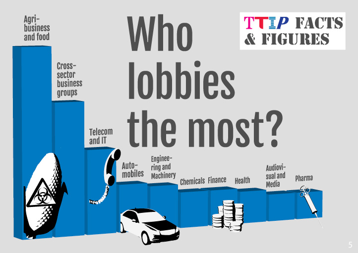 Правителството участва предимно в диалог с бизнеса и в конференции, спонсорирани от големите корпорации, които са лобисти за приемането на ТПТИ. В доклада са посочени конкретни данни от регистрите на лобистите в САЩ и в Европейската комисия за милионите, които харчат тези корпорации за лобистка дейност по ТПТИ.
