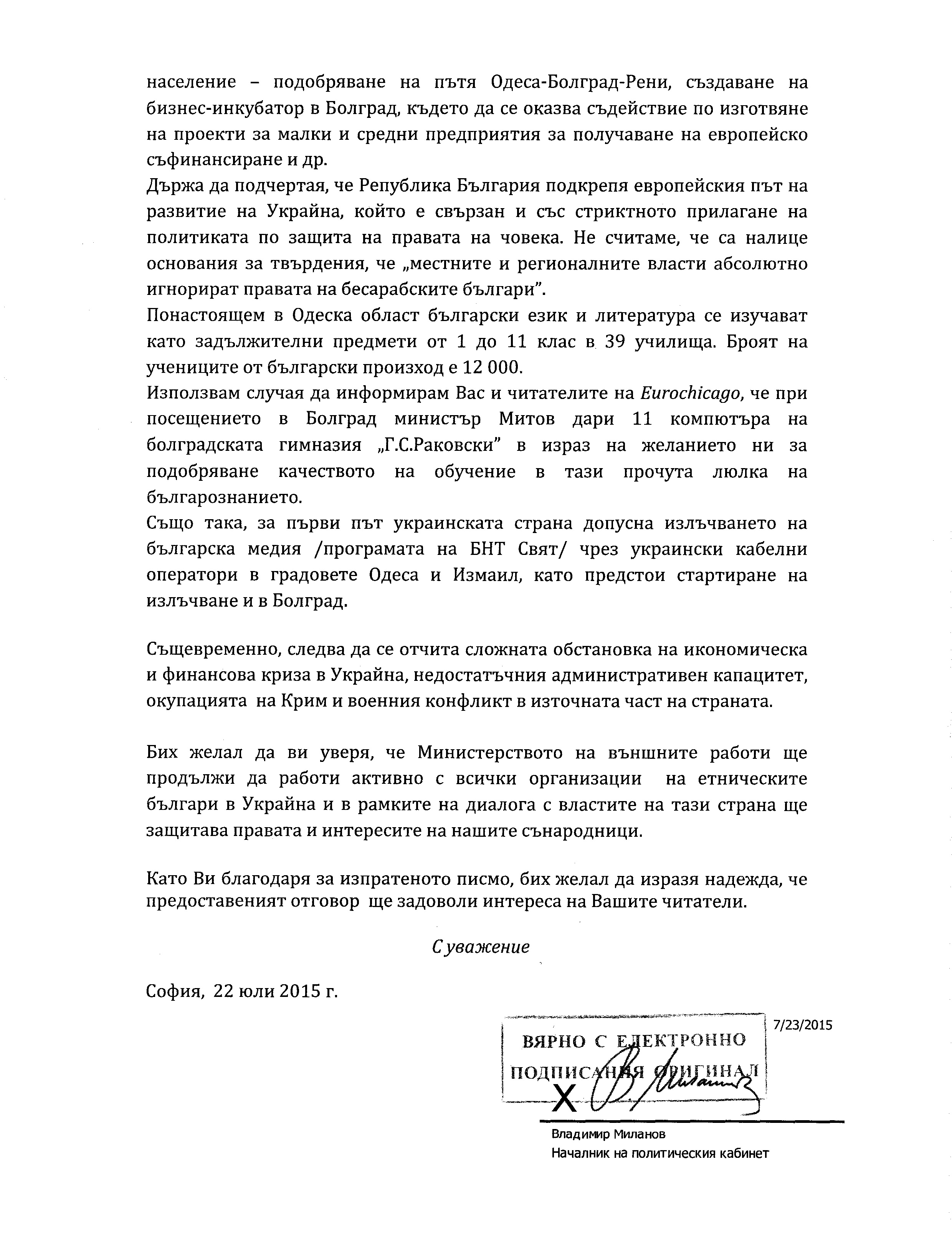 Във връзка с публикувано в нашето издание писмо на Дружество на бесарабските българи „Св. св. Кирил и Методий“ (вж. тук), и съобщение от нашето издание до Приемната на МС, Министерството на външните работи, Комисията по политиките за българите в чужбина и др. (вж. тук), днес се получи отговор от МВнР. Той е подписан от началника на политическия кабинет на министерството Владимир Миланов и носи дата 22.07.2015 г. Благодарим за своевременния отговор, даден от началника на политическия кабинет г-н Миланов.