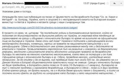 В писмото се казва, че, цитирам: „За последните години в дипломатическия протокол, който се подготвя от Министерството на Външните работи на Украйна, се очертава една тенденция за ограничаване на срещи и общуване с етническите българи по време на визитите на официалните лица на България в Украйна. Какво стои зад това? Украйна е подписала и ратифицирала всички международни договори, конвенции, хартии за правата на националните малцинства и ги е ратифицирала. Обаче в действителност има големи разминавания между тях и действията на властите в Украйна. Провъзгласявайки европейския път на развитие и говорейки за демократични реформи, местните и регионалните власти абсолютно игнорират правата на бесарабските българи по местата на тяхното компактно местоживеене, което явно се толерира и от Киев.