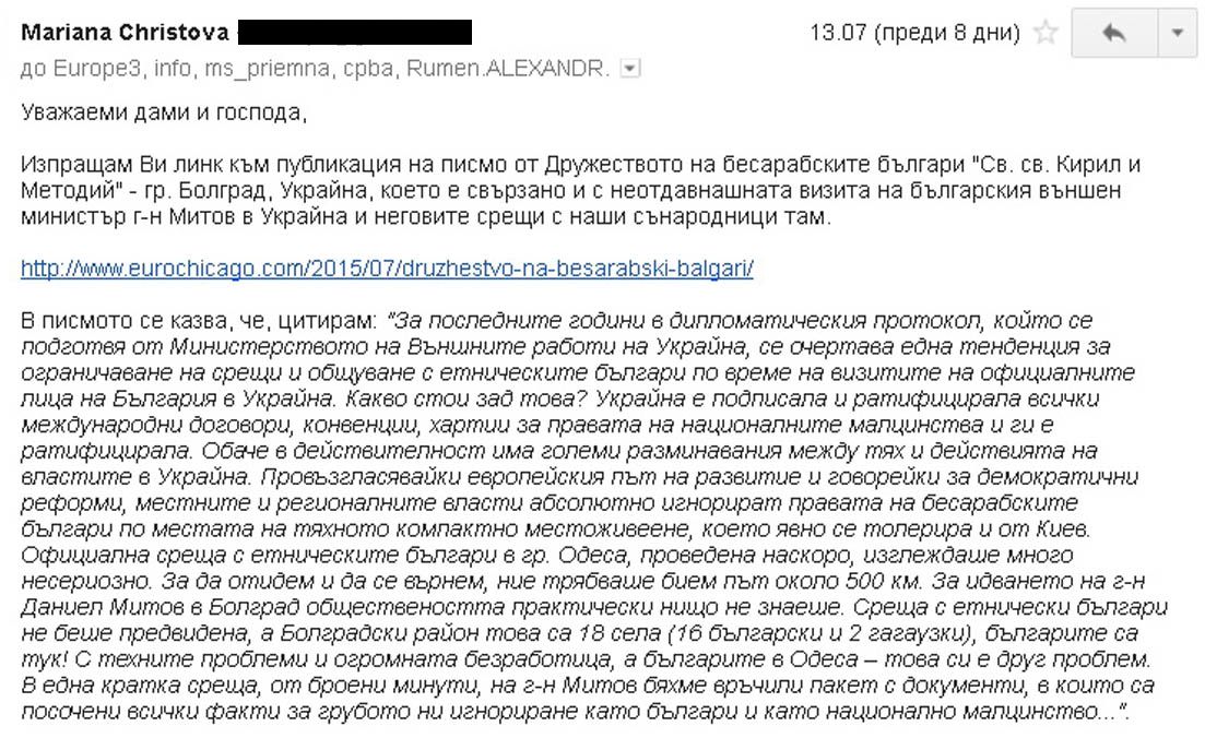 Изпращам Ви линк към публикация на писмо от Дружеството на бесарабските българи „Св. св. Кирил и Методий“ – гр. Болград, Украйна, което е свързано и с неотдавнашната визита на българския външен министър г-н Митов в Украйна и неговите срещи с наши сънародници там.