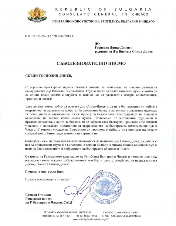 Генералното консулство на Р. България в Чикаго изпрати съболезнователно писмо до опечалените роднини на д-р Виолета Симов-Динев.