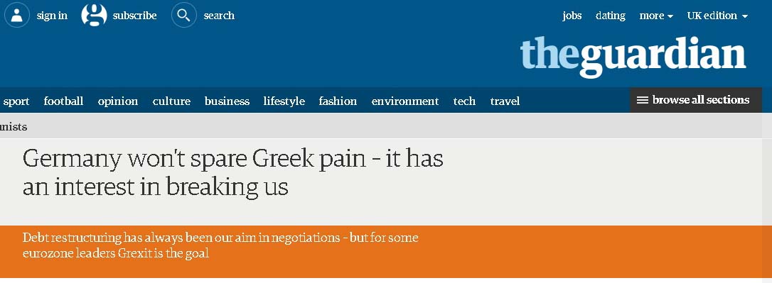 „Германия няма да пощади Гърция – тя има интерес да ни пречупи“ – това пише в The Guardian бившият вече гръцки финансов министър Янис Варуфакис. Текстът в превод на български е публикуван в Dokumentalni.blog.bg. Преводът е на Илиян Станчев.