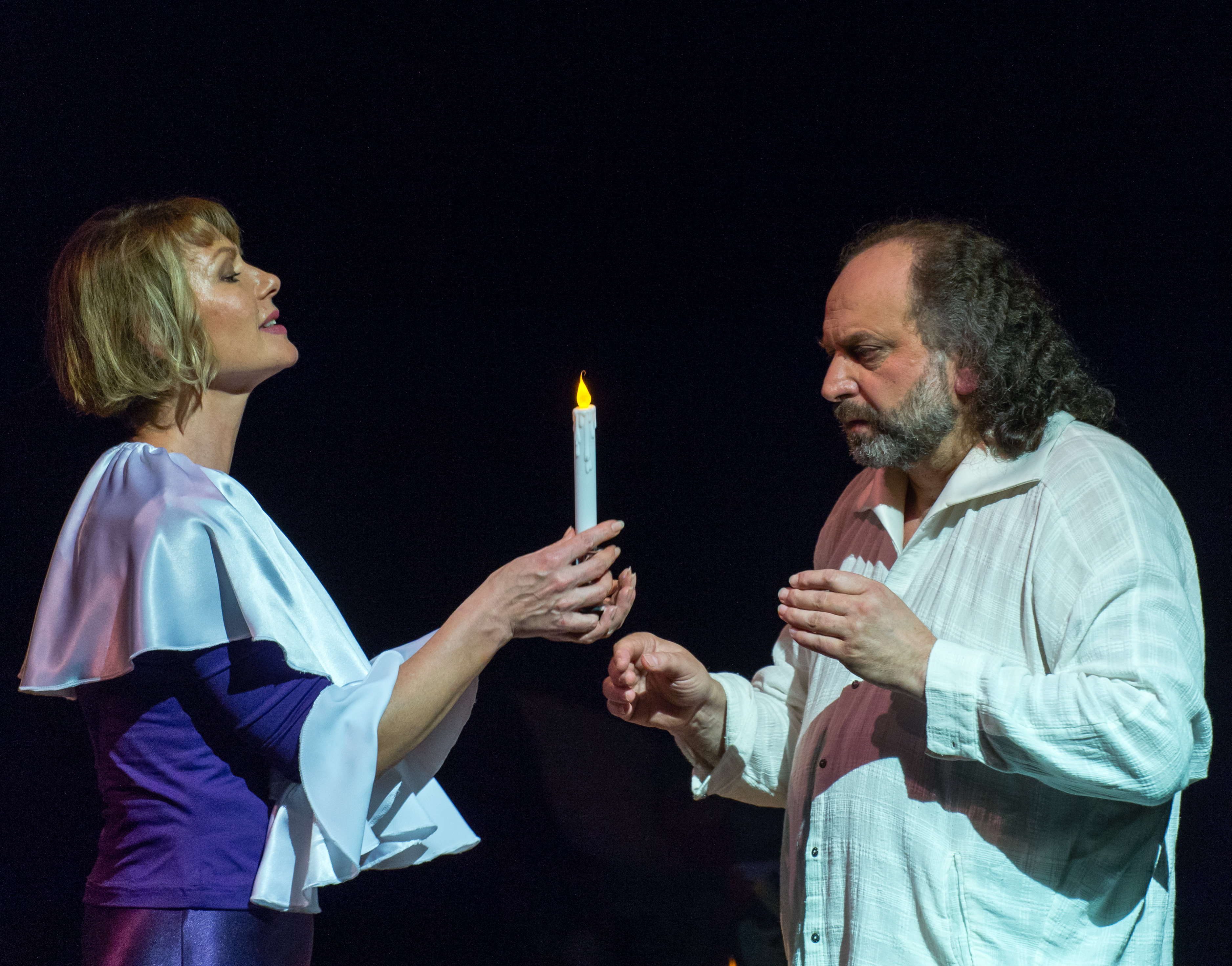 Озаренные цветом любви, мы становимся свидетелями наиболее заметных эпизодов из жизни великого Художника. Детство и юность в Витебске, мама, жена и муза Белла, голод, революция, годы в Петрограде, фашизм, Париж, далее везде… От рыбной лавки к Лувру – дистанция огромного размера. Мало кто выдерживал испытание ТАКОЙ славой. Шагал выдержал и остался таким же, каким и был: наивным, смешливым ребенком. А потом была вечность и снова Витебск, родные люди, любимые, живые… Режиссер спектакля Арнольд Швецов прав: “Шагал – это загадка, разгадать которую не дано никому. Невозможно до конца ощутить, понять Шагала, как невозможно до конца понять любого гения. Гениальность непостижима!..” Гения сыграть трудно, как трудно сыграть и его Музу. Актерам Вячеславу Кагановичу и Марине Смолиной это удалось. Они играют все мужские и женские роли, за считанные секунды перевоплощаясь из одного персонажа в другой. Настоящим открытием спектакля стала для меня Марина Смолина. Видно, что актриса соскучилась по сцене. Яркая, выразительная работа!.. Романтическая притча (таков подзаголовок спектакля), написанная белым стихом, предполагает наличие музыки. Музыки в спектакле много. Режиссер придумал роль Музыканта (Михаил Клейнерман), которой не было в тексте. “Музыкант играл на скрипке…” Скрипач, он же свидетель, соучастник, попутчик Художника – он органично введен в ткань повествования, и часто его глазами мы смотрим на происходящие в жизни Шагала события. Стилистически точное оформление сцены (художник-постановщик – Ирина Ратнер) помогает создать определенное настроение.