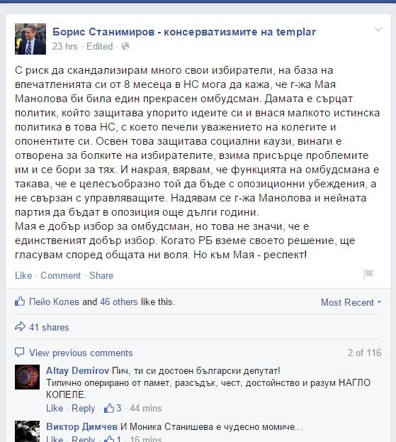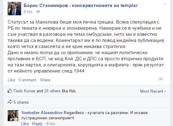 Статусът за Манолова беше моя лична грешка. Всяка спекулация с РБ по темата е невярна и злонамерена. Намирам се в чужбина и не съм участвал в разговори на тема омбудсман, нито ми е известно такива да са водени. Коментарът ми е по повод медийна публикация, която четох в самолета и не крие никаква стратегия.
