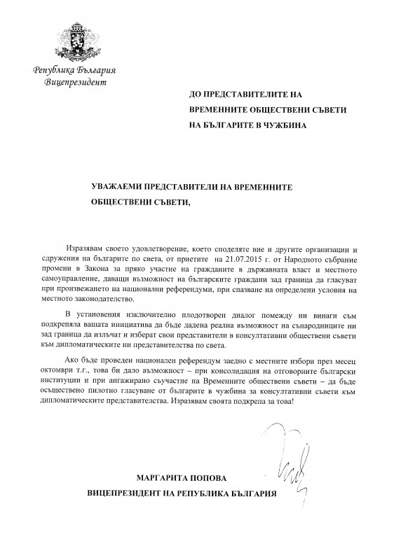 „Ако бъде проведен национален референдум заедно с местните избори през м. октомври т.г., това би дало възможност – при консолидация на отговорните български институции и при ангажирано участие на Временните обществени съвети – да бъде осъществено пилотно гласуване от българите в чужбина за консултативни съвети към дипломатическите представителства. Изразявам своята подкрепа за това!“ – пише вицепрезидентът Попова.