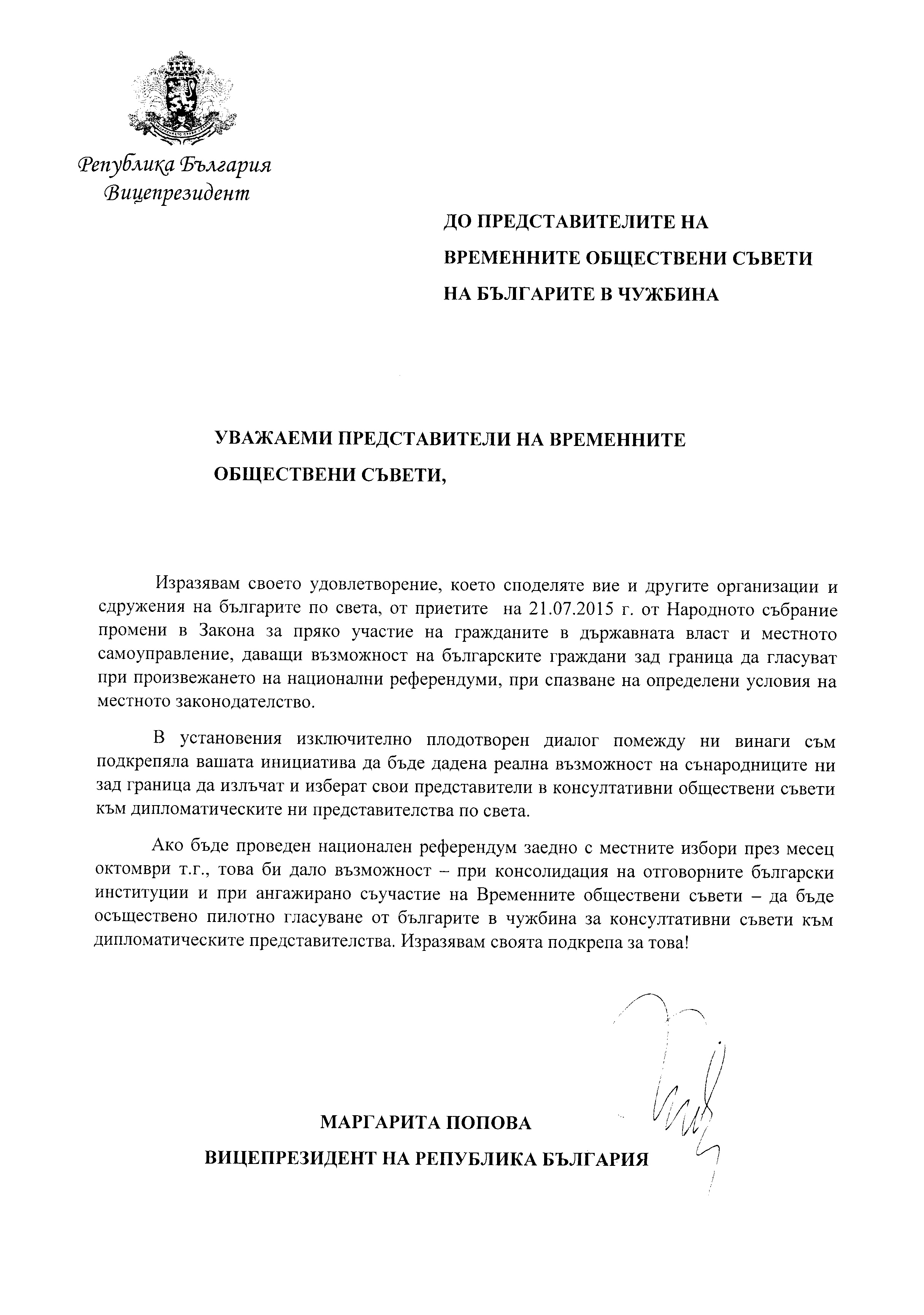 Вицепрезидентът няма правомощия за директното решаване на въпроса с избори на ОС, но заедно с председателя на ДАБЧ (вж. тук) и националния омбудсман (вж. тук), г-жа Попова подкрепи пилотното провеждане на такива избори за създаването на консултативни обществени съвети към дипломатическите и консулските представителства по света. Тя изрази тази своя подкрепа в писмо от днес, 28.07.2015 г., адресирано до представители на Временните обществени съвети на българите по света.
