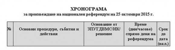 № 5. ЦИК изпраща на Министерството на външните работи решенията за условията за образуване на избирателните секции извън страната и за реда за гласуване на българските граждани извън страната. Основание – § 2 от ПЗР на ЗПУГДВМС и чл. 11, ал. 2 от ИК. Срок – Незабавно, но не по-късно от 56 дни преди деня на националния референдум; 29.08.2015 г.