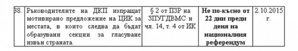 № 37. ЦИК проверява дали лицата, подали заявления за гласуване извън страната, отговарят на изискванията да гласуват в националния референдум. Основание – § 2 от ПЗР на ЗПУГДВМС и чл. 17, ал. 4 от ИК. Срок – Не по-късно от 22 дни преди деня на националния референдум; 02.10.2015 г.