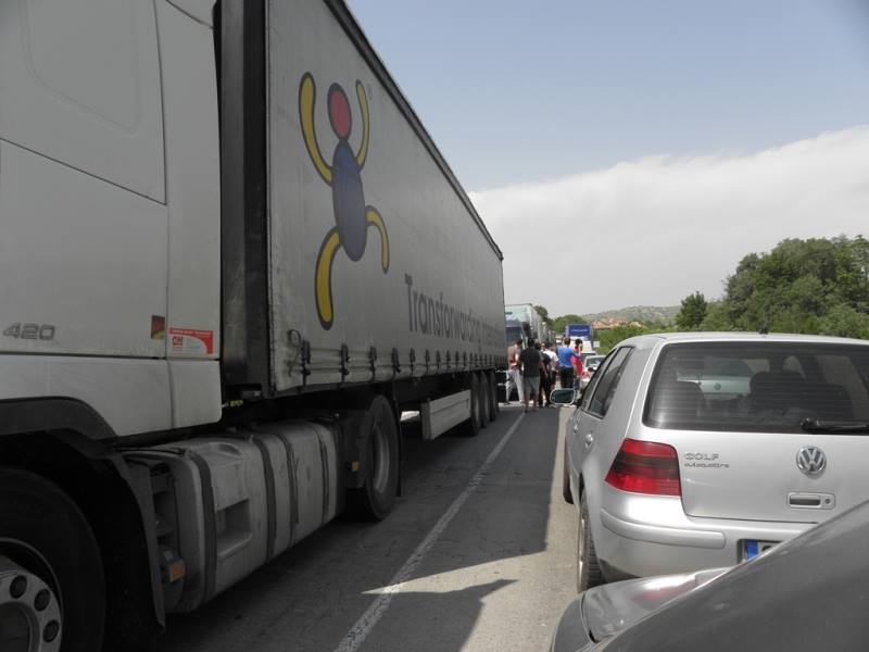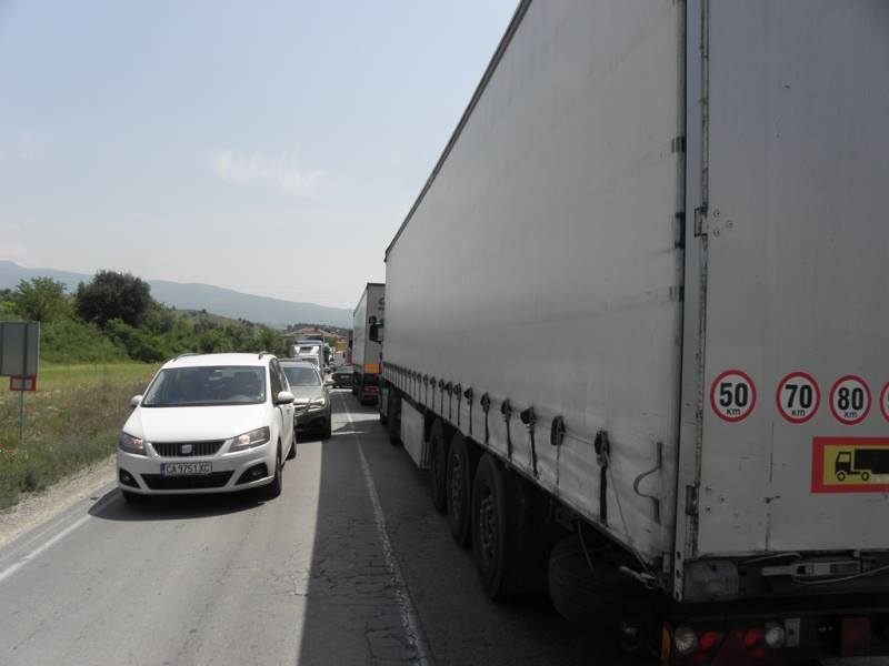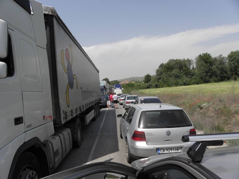 И така, първа бензиностанция – пак свършили. Престрашаваш се и тръгваш без винетка, все пак с пари ще се оправиш… И ето я изненадата – петстотин тира още в самото село Кулата са заели в опашка платното вляво, за напускане на родината. Другото платно се ползва за разминаване на коли, напускащи родината, и тирове, автобуси, и ние на едно. Естествено не е лесно. След около час и половина успяхме да преминем тези два три километра.. УРА. (Отново уточнение, на една бензиностация имаше месечни винетки – цена 25 лева. Казвам го за сравнение с цената на еднократното минаване в Гърция, дето споменах по-горе.) Газ на педала и скоростта вече е цели 60 километра. Естествено изпреварването е възможно само за самоубийците с автомобили от 200 коня нагоре. И така послушно караш около 2 часа, гледайки вляво вече 10 години строящата се магистрала, а вдясно къщи неомазани, коне и каруци. Ето че вече 100 километра са преодолени и пътят става двоен с по две платна… ЕХААА – 20 минути и си в СОФИЯ. Околовръстното обаче те сваля отново на земята, за да не заспиваш на волана. И ето поредният типично български избор – ПЕТРОХАН или БОТЕВГРАД. И избора на първия заради 60-те километра по-малко се оказва автоматично записването ви в състезанието Париж-Дакар.