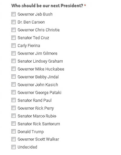 Десетимата кандидати на номинацията на Републиканската партия за кандидат-президент на САЩ с най-добър рейтинг, които участват в диспута на Фокс нюз, са Доналд Тръмп, бившият губернатор на Флорида Джеб Буш, син и брат на предишни президенти на САЩ, губернаторът на Уисконсин Скот Уокър, бившият губернатор на Арканзас Майк Хакъби, пенсионираният неврохирург Бен Карсън, сенаторите Тед Круз (Тексас), Марко Рубио (Флорида) и Ранд Пол (Кентъки) и губернаторите Крис Кристи (Ню Джърси) и Джон Кейсик (Охайо). /www.fbr.bg/