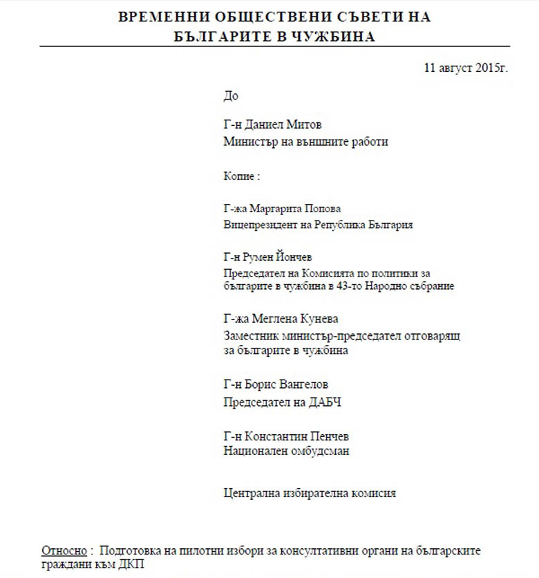 Временните обществени съвети на българите в чужбина изпратиха вчера, 11.08.2015 г., писмо до българския външен министър Даниел Митов. Писмото е относно подготовка на пилотни избори за консултативни обществени съвети към дипломатическите и консулските представителства, и е изпратено с копие до вицепрезидента Маргарита Попова, председателя на Комисията по политиките за българите в чужбина Румен Йончев, вицепремиера Меглена Кунева, председателя на ДАБЧ Борис Вангелов и националния омбудсман Константин Пенчев.