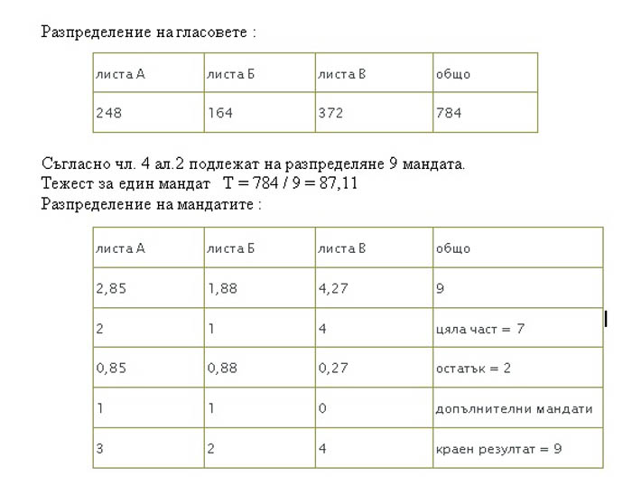 § 3 „Методът на най-големия остатък (Хеър-Ниймайер)“ съгласно чл.7 ал.2 е серия от математически операции, които могат да се илюстрират със следния пример .