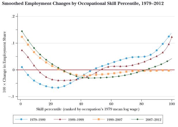 Where these curves intersect the red line has been moving to the right, meaning that more and more middle-skill jobs have been lost in a way that even increasingly eats into higher and higher skill ranges. This is a hollowing out of the middle and even upper-middle. Jobs that require what’s considered between a low and high amount of skill have been disappearing. This appears to reflect the loss of the middle class. As each decade passes, the jobs that require mostly a medium amount of skill are simply going away, replaced instead with jobs requiring less skill ,not more skill, and thus jobs that tend to pay less, not more.