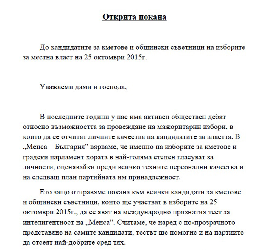 Тук можете да видите писмото, с което „Менса – България“ отправя публична покана към партиите и коалициите – Pokana kam kandidatite za kmetove 25.10.2015