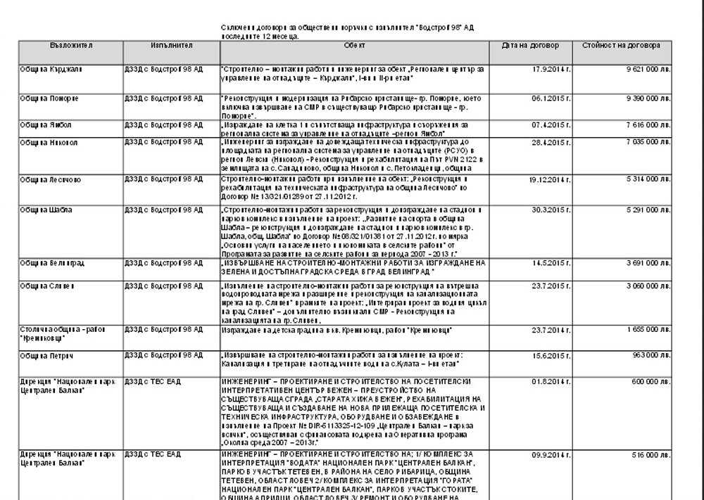 Нов световен рекорд постави фирма „Водстрой 98“. Само за 12 месеца тя е спечелила 18 обществени поръчки за близо 57 млн лева. „Водстрой 98“ е смятана за собственост на депутата от ДПС Делян Пеевски – неофициално. Това пише в свой материал Frog news. Ето още какво се съобщава в този материал:
